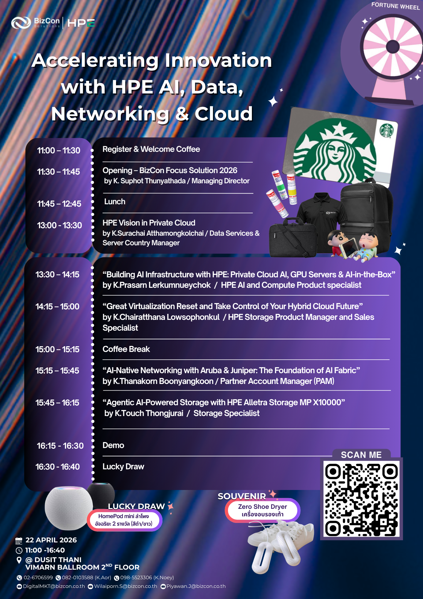 BizCon Solutions ร่วมกับ Hewlett Packard Enterprise (HPE) ร่วมกันจัดงานภายใต้หัวข้อ “Accelerating Innovation with HPE AI, Data, Networking & Cloud” เมื่อวันที่ 22 เมษายน 2026 ณ ห้อง Vimarn Ballroom ชั้น 2 โรงแรมดุสิตธานี กรุงเทพฯ